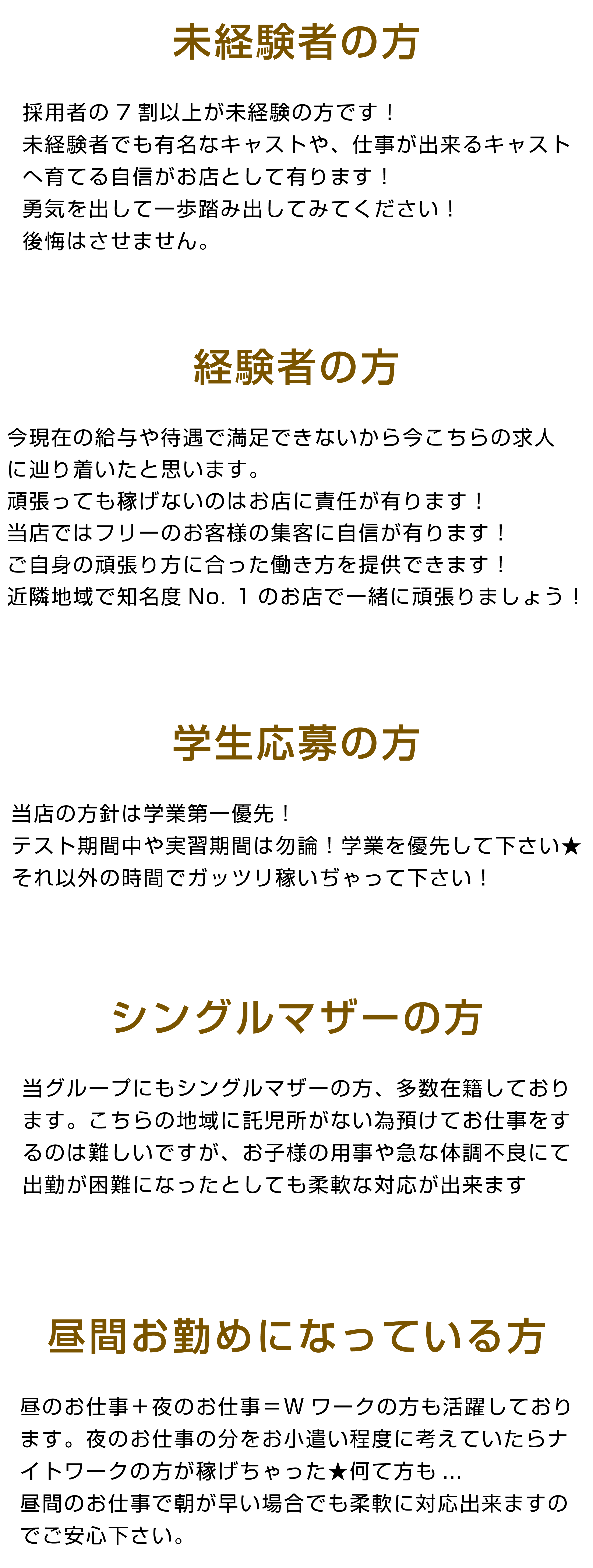 体験入店はお店指定の期間なら何度でも出来ます!(初日のみボーナス待遇) 入店講習&接客講習無料 |