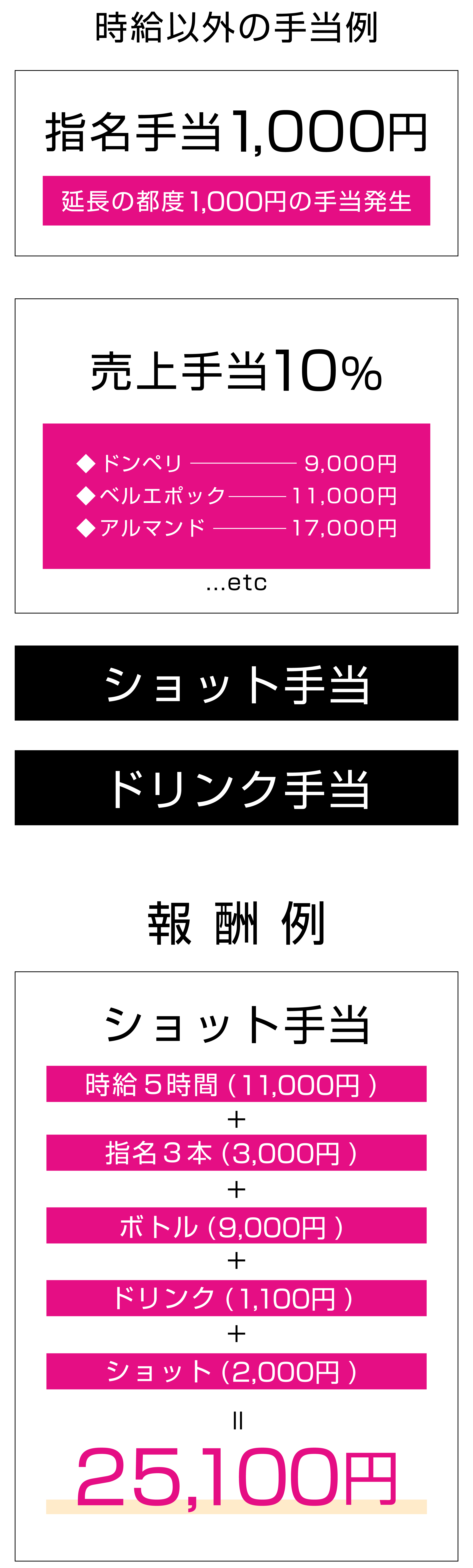 ★指名手当1,000円 ★売上手当10% ★ショット手当、ドリンク手当 |